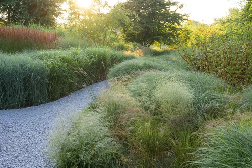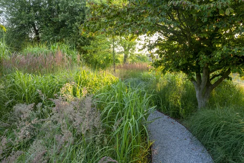 The trees will be procured and planted at a height of twelve metres, with a canopy width of two metres. The trunk will have direct contact with the grass, or path, and for those planted along the ramp, a small drainage area around the base of the trunk with irrigation pipe will be secured. The roots of the Cypress will be invisibly protected beneath the surface. Excavation will be minimal - the Cypress root system is not thick or penetrative, instead it branches evenly and forms a matted layer across the top layer of soil. It requires only two metres soil depth, which is soil that will be replenished. The existing trees on site will not be impacted.